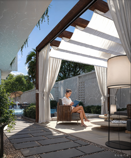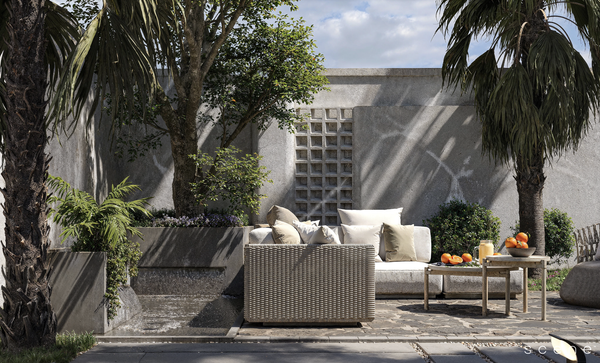 Vải nội thất ngoài trời với bảng màu hiện đại, bề mặt dệt tinh tế và cấu trúc chắc chắn giúp không gian:
