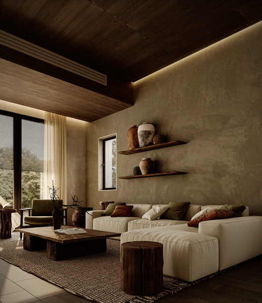 Những sắc màu này lấy cảm hứng từ đất mẹ – vừa gợi cảm giác vững chãi, vừa mang lại chiều sâu và sự kết nối cảm xúc cho không gian phòng khách.